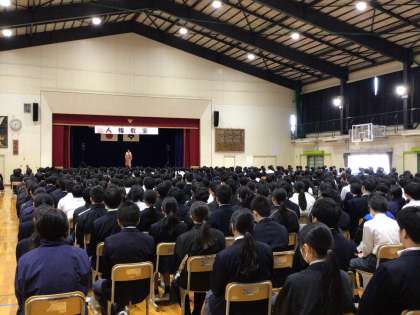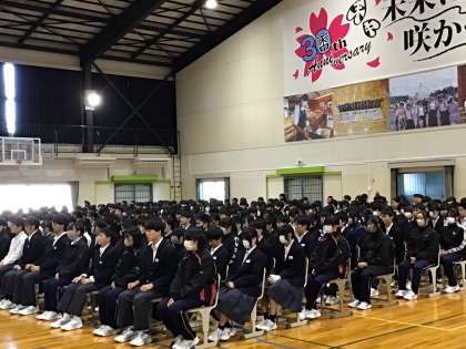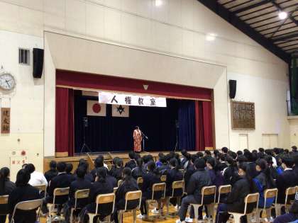 金曜日の六時間目に体育館で「人権集会」を行いました。今回講師としてお招きした若渚(わかな)さんは、全盲の歌姫として活躍されている方です。今回の講演会では、素敵な歌と言葉で生徒たちにたくさん大切なことを伝えてくださいました。
