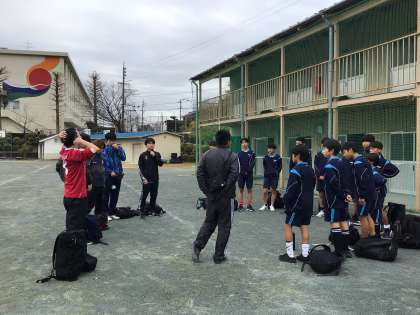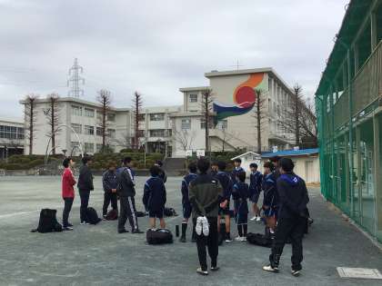 写真は今日の午前中のサッカー部の練習風景です。練習が終わり、生徒たちは地域指導者からのお話を聞いています。今日は3名の地域指導者が来てくださり、卒業生も何人か指導に来てくれていました。休日を使って生徒の指導に来てくださり、本当に感謝しています。
