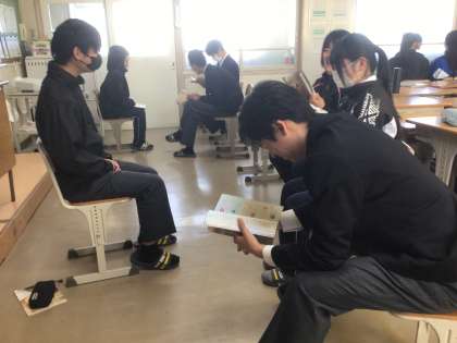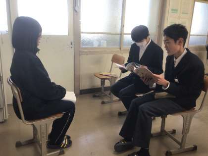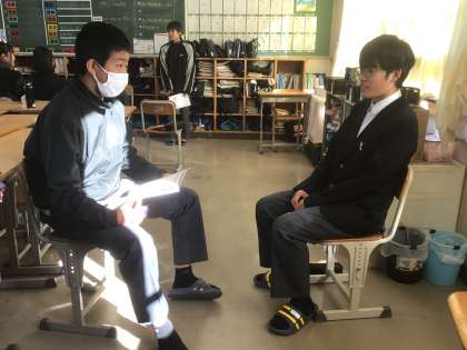 写真は金曜日に撮ったものです。3年生は受験に向けて面接練習を各学級で行っています。面接試験の対応は学校ごとに異なっており、面接試験がある高校とない高校、個人面接か集団面接か、一般入試では面接はないけれど推薦入試ではある、など様々ですので、今回の入試で全員が面接を受けるわけではありません。しかし、この先、生徒たちはどこかでこうした経験をすることになると思います。