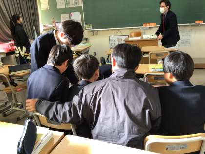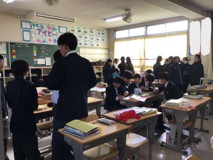 休み時間の1年生教室です。定員ふたりの椅子に何人!?