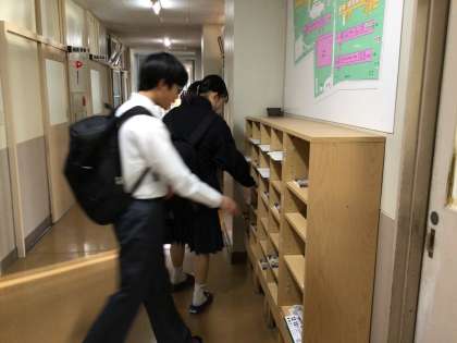 8時に昇降口が開いて教室に向かう生徒たち。集配物の係の生徒たちは、登校してくるとすぐに職員室前の集配物の棚に寄って学級の棚に入っているものを持っていきます。