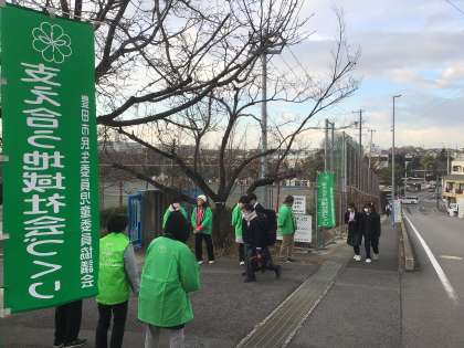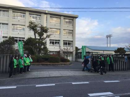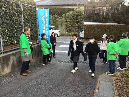 朝の気温はとても低く、骨身にしみる寒さの中、緑色のジャケットを羽織った民生委員の皆さんが、4つの門に分かれて元気よく「おはようございます!」と声を掛けてくださいました。