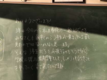 昨日の風は少しおさまったものの、気温は低く寒い朝です。今日は私立専修学校の一般入試で多くの生徒が朝から受験会場に向かっています。無事に会場につき、落ち着いて受験に臨んでくれることを祈っています。