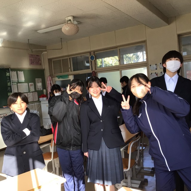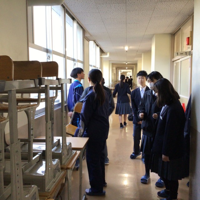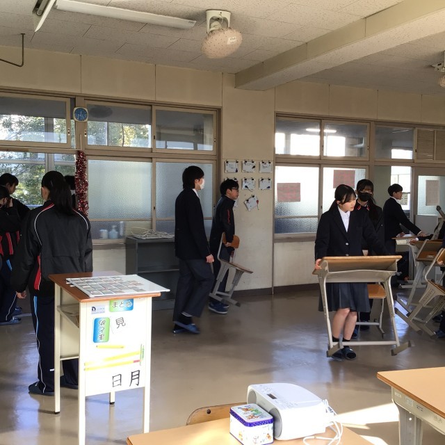 先週の金曜日、1年生が教室のワックスがけをしました。今朝登校した生徒たちは、ワックスをかけるために廊下に出していた机や椅子を教室の中に入れる作業をしていました。1年間使った教室をきれいにして後輩に渡します。教室の床が朝日を浴びてピカピカに光っていました。