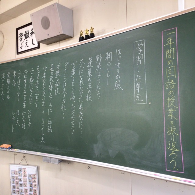 1年生の国語の授業にお邪魔しました。今日がこのクラスの国語の授業は最後です。先生が黒板に1年間学習した題材名や単元名、内容を書きました。こんなにたくさんの内容を学習したんですね。説明文、物語文、話し合い活動、古文、その他いろいろ。どんな学習が心に残っていますか。