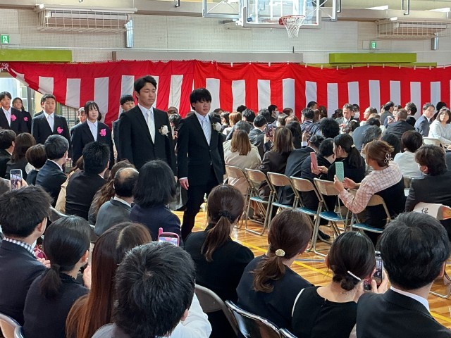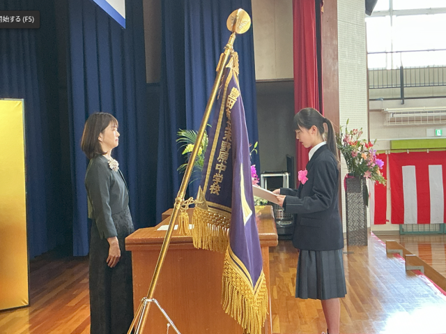 少し緊張気味の1年生が入場すると、会場は温かな拍手で包まれました。その後、力強い太鼓で幕が開くと、会場は凛とした雰囲気となり、歴史と伝統を感じさせる入学式・始業式が粛々と進んでいきました。1年生の返事や代表生徒の挨拶から、これから始まる中学校生活への期待と意欲の高さを感じました。また、2・3年生の背筋をピンと伸ばした姿から、これまでの末野原中学校をつくってきた自信を感じました。