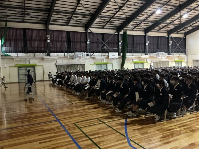 始めに職員紹介をしました。本校は大変多くの教職員がおり、自分と関わりのある先生の名前しか知らない生徒もいるようですが、これをきっかけにいろいろな先生を覚えて、困ったときはどの先生でもよいので頼ってほしいです。