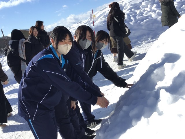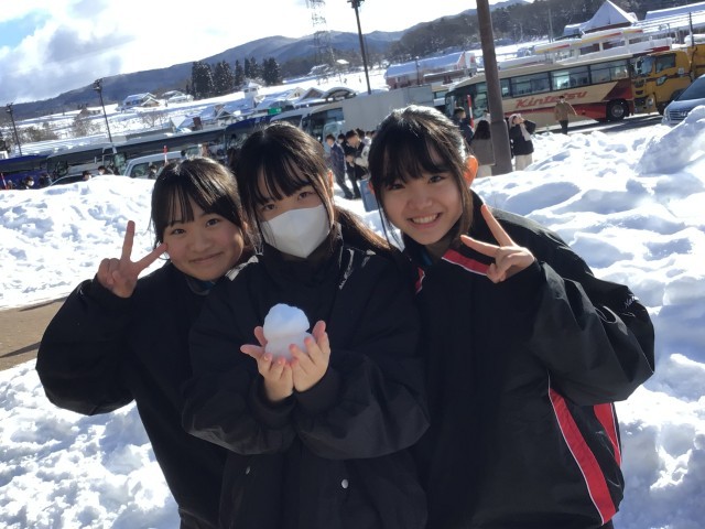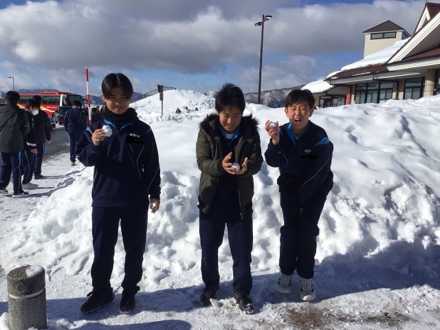 ひるがの高原SAに到着。2回目の休憩です。雪玉や雪だるまを作って大喜びの生徒たち。
