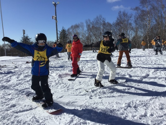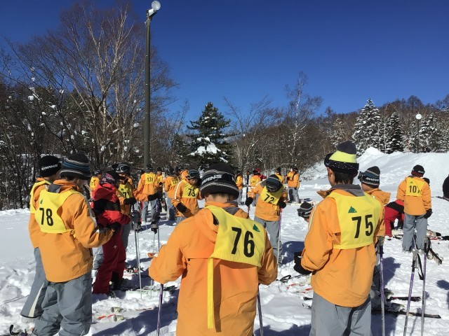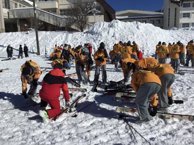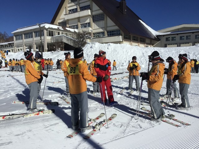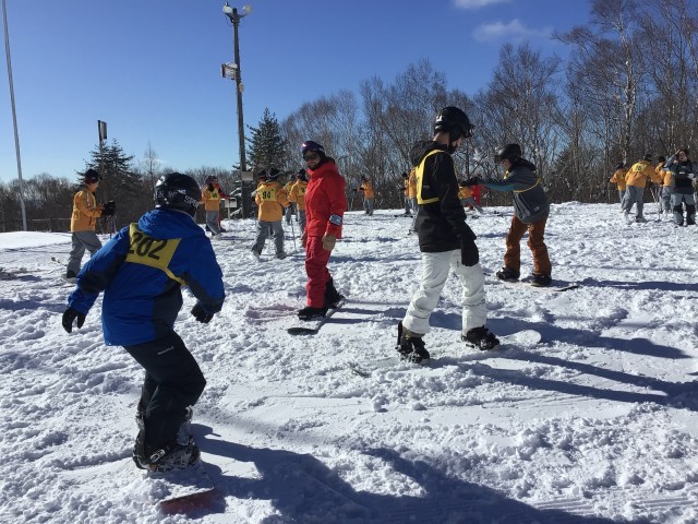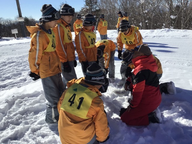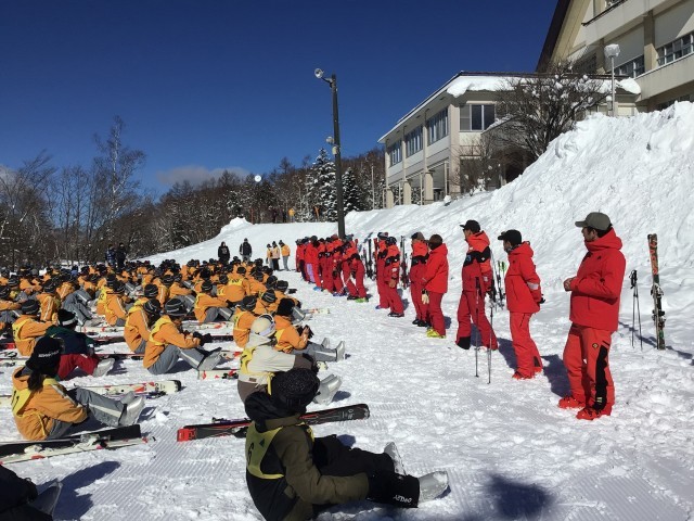 開校式を行い、各グループに分かれて実習が始まりました。多くの子が初心者ですが、経験者も中にはおり、レベル別の班編成になっています。スノボも数人います。インストラクターの皆さん、今日と明日、ご指導よろしくお願いします!