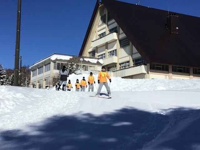 今から1回目の実習が始まります。初めてスキーを経験する子たちはブーツを履いてスキーやストックを持って歩くだけで大変そうです。