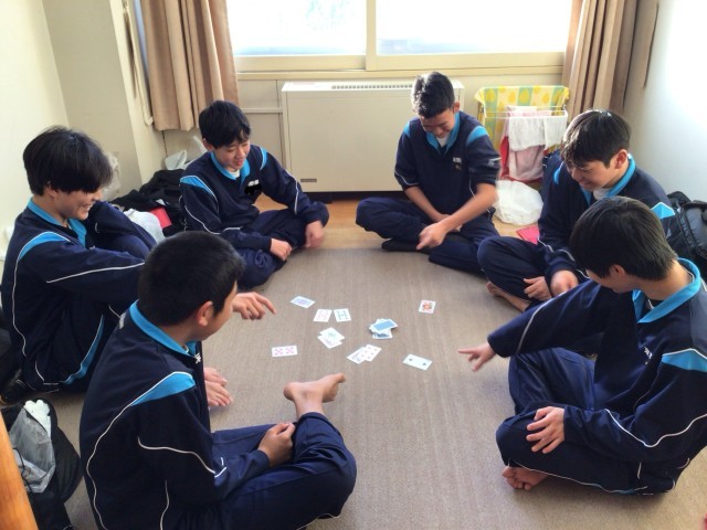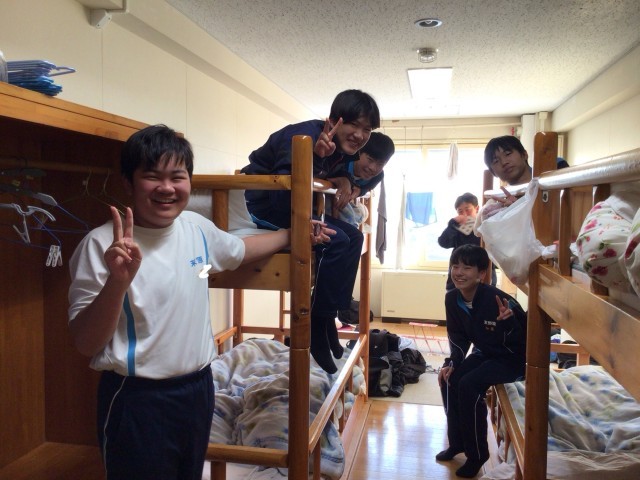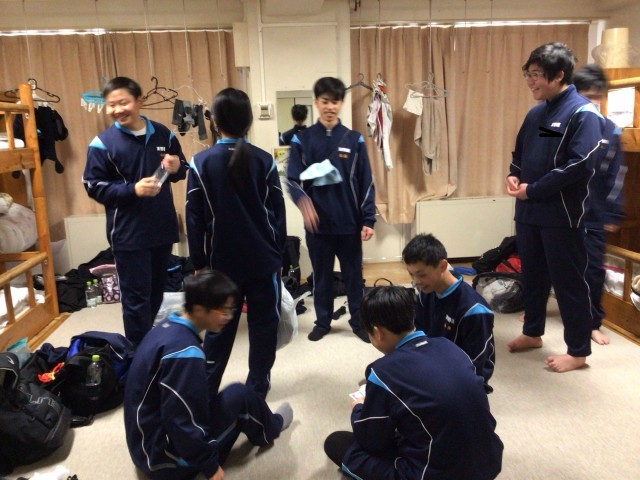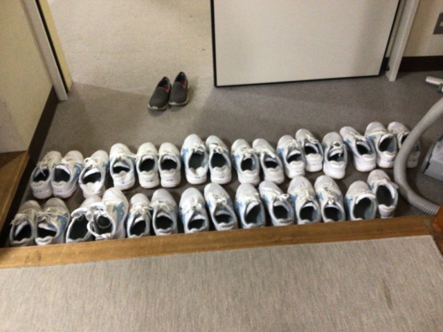 夕食を待つ時間。全員検温をして健康状態を確認しています。入り口の靴が綺麗に揃っていました。男子生徒の部屋です。