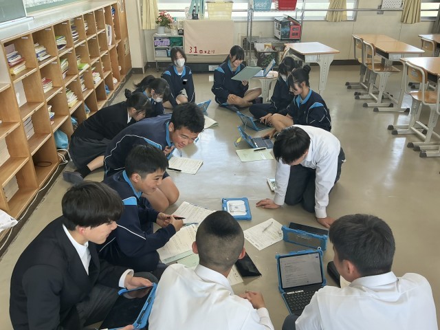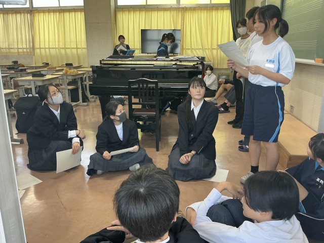 5時間目の通学団会では、全校生徒が通学団ごとに分かれて、通学路の確認をしたり、危険箇所の確認をしていました。3年生が1年生に優しく声をかけてくれたので、1年生も安心して参加できたようです。