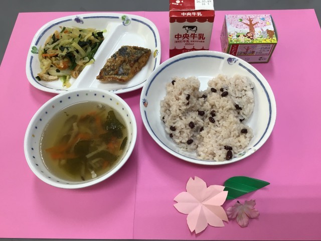 少し早いですが今日のメニューは卒業祝い献立です。赤飯、サワラの唐揚げ、おひたし、沢煮あん、牛乳、米粉のイチゴケーキです。春らしく給食を飾ってみました🌸