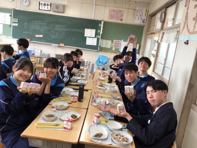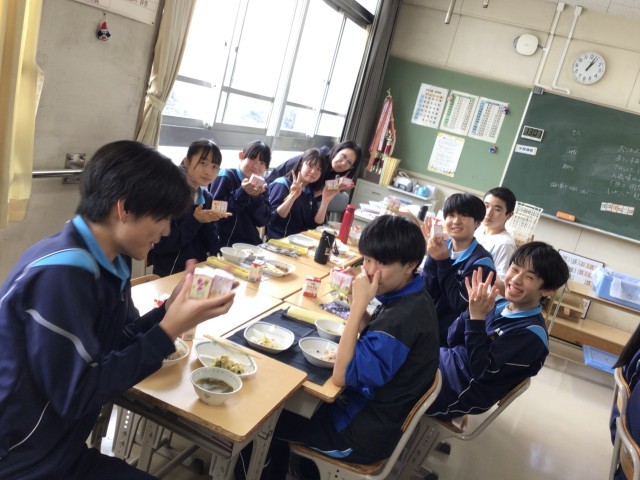 3年生教室に取材に行きました。卒業献立、嬉しいですね!今日を含めて学校で給食が食べられるのは残り4回になりました。生徒たちが手に持っている箱はイチゴケーキです。柔らかくて幸せな気持ちになるケーキでした。おいしかったね。ごちそうさまでした!