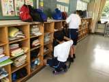ロッカーが美しい教室に生徒たちが登校してきました。汗をかいてお茶を飲む生徒もいま...