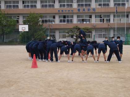 体育祭の学年練習時間が設定されました。昨年より変更があったのは生徒会種目から学年競遊となったことです。3年生は龍の背渡りになりました。並んだ生徒の背中を素早く一人の生徒が移動します。落ちないようにサポートの生徒が両側から支えます。練習を見ていると、繰り返すたびに少しずつ工夫の声があがります。本番は、まだまだ先です。各クラスで作戦を練り、絆を深める時間となりますように。