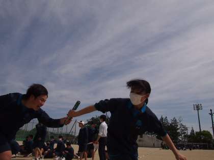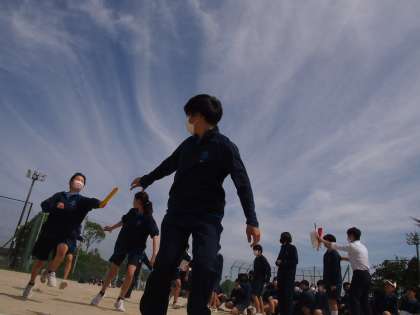 薫風や 繋ぐバトンに 沸く子らよ 公開日 2023/05/01 更新日 2023/05/01 お知らせ 三年生は先週の金曜午後に体育祭3種目すべての模擬戦を行いました。他学年も大縄跳び、全員リレーのバトン練習など熱が入ってきました。少しコンパクトな体育祭ですが、学級の絆を深めたり、新入生は先輩の姿に感じたりとよいきっかけづくりになっています。3年生の先輩が大縄跳びのコツを新入生に伝える場面もありました。先輩も成長中です。