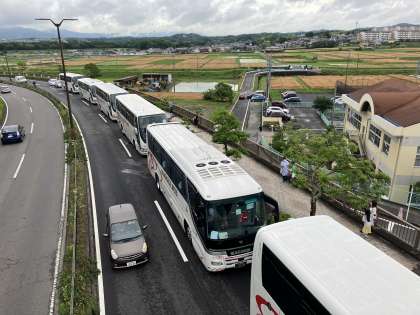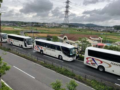 修学旅行の朝、登校完了は8時。クラスのバスに直接向かいます。いよいよ出発です。