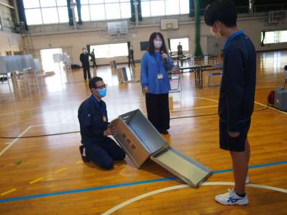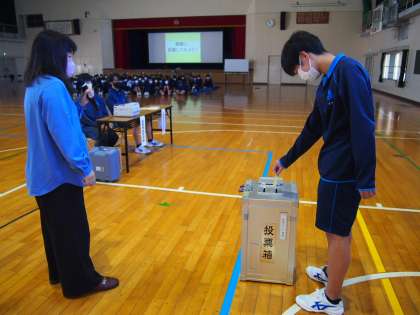 投票所ロールプレイや秋日和 公開日 2023/11/22 更新日 2023/11/22 お知らせ 「選挙について学ぶ」特別な1時間・・社会の授業の一環として、市役所の選挙管理委員会の方から、様々な選挙の形を教えていただきました。座学ではなく、投票所を設置し、役割分担をして体験的な学習をすすめました。選挙権をもつ年齢まであと3年。政治に無関心な若者と呼ばれないために今から準備をはじめましょう。