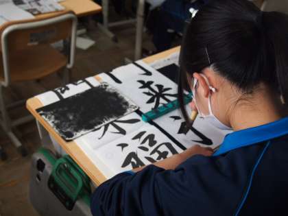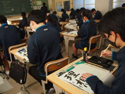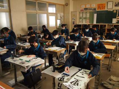 書き初めに福筆休めて一瞥 公開日 2024/01/09 更新日 2024/01/09 お知らせ 書き初め大会が行われました。2年生は「笑門来福」と書きました。書いた作品を新聞紙の上に広げ、ちらりと見ます。まだまだ、もう少し・・粛々と進む書き初めの時間、少し緊張した雰囲気がいいですね。新しい年、高中生に福来れ!