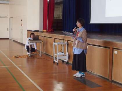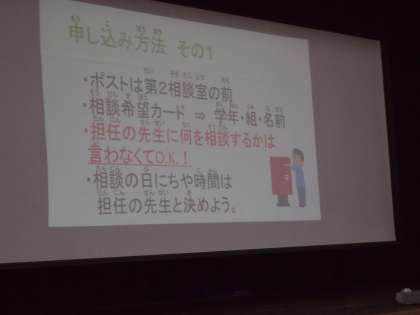 1年生の心の集会がありました。スクールカウンセラーの刀祢先生が心のしこりをとる方法を教えてくださいました。トントンと自分の心に訊いてみる、そんな動作が可愛くみえました。なにか困りごとがあれば、すぐに先生に相談できる。そうした関係を「ともに」という学年訓が示しています。ご家庭で本日の心の集会で感じたことを聞いていただけると幸いです。