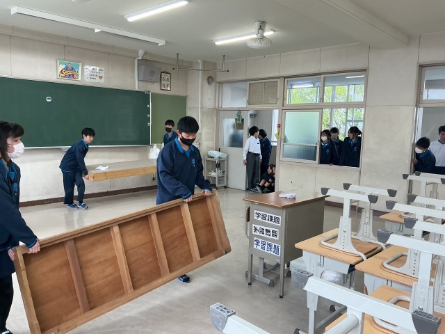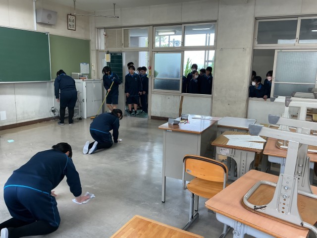 高橋中学校では、毎年4月の始めに3年生が1年生に清掃指導を行います。