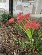 学校の保健室前の植栽にようやく花開いた彼岸花を見つけました。今年の夏が長かった...