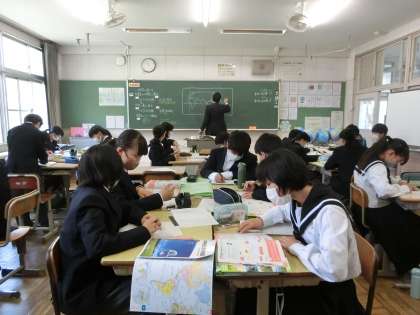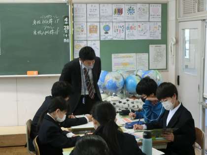 教科担任がフリーハンドで世界地図を描いていく様子を見て、生徒たちも熱中して活動に取り組んでいました。