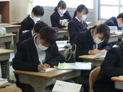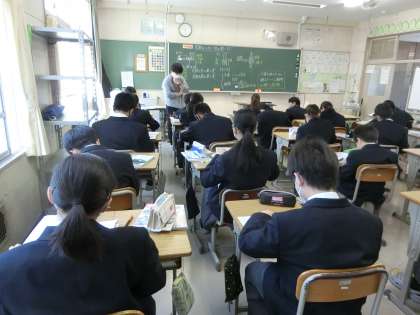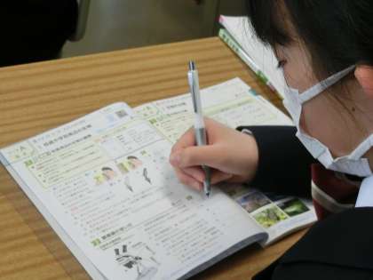 黒板に書かれたイラストを丁寧にノートに写したり、問題集を使って授業の内容を復習したりと、連休明けでもしっかりと学習に向かっていました。
