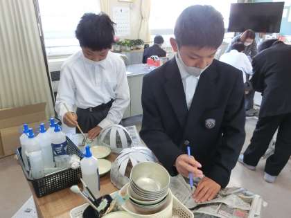 詩の朗読発表に向け、雰囲気づくりのための登場人物のお面づくりに取り組んでいました。