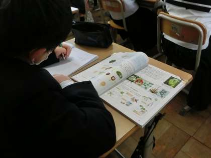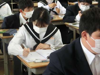 黒板に書かれたイラストを丁寧にノートに写したり、問題集を使って授業の内容を復習したりと、連休明けでもしっかりと学習に向かっていました。
