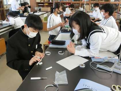 グループで役割を分担し、実験の手順をしっかり確認したあと、協力して取り組んでいました。