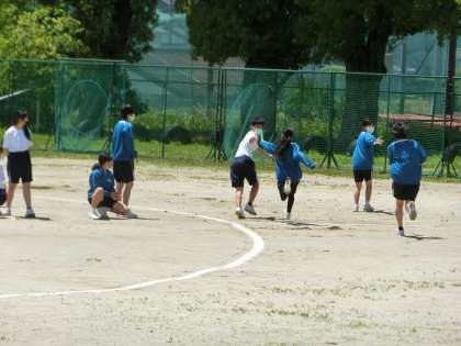 バトンパスの注意点を確認したあと、実戦で試してみます。本番までにもっと精度が上がるように、繰り返し練習に励んでほしいと思います。