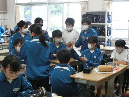 2,3年生が運動場での練習に繰り出す中、1年生は体育祭に向けての目標を決めていました。また、各種目の選手の選出やルール確認等が行われていました。