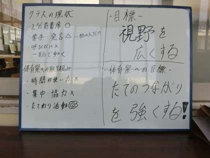 5/10 目標に向かう努力に期待! 公開日 2023/05/10 更新日 2023/05/10 特別活動 3年生のあるクラスの廊下に掲示されていたクラスの課題や目標です。 生活全般に関してのものと体育祭に特化してのものの両方が示されています。 意識の高さがクラスの生徒全員の行動に現れることを期待したいと思います。
