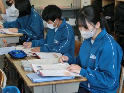 5/11 集中力の継続 2 公開日 2023/05/11 更新日 2023/05/11 各学年から 2年2組の英語の授業の様子です。 教科書の本文をリスニングで穴埋めをしていく学習です。 まずは自分で考え、その後仲間と確認し合い、最後は各自で教科書で正解を確認します。限られた時間でいかに早く正確に答えを見つけ出すかが問われるため、常に集中力が要求される授業でした。