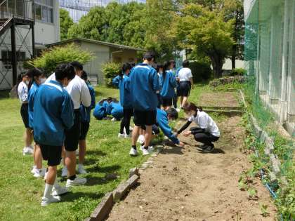 技術科ではグリーンカーテンのためのツル科の植物を植え、家庭科では花もその後の綿の収穫も楽しめる綿を植え、栽培や収穫の体験を行っています。