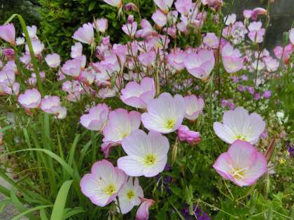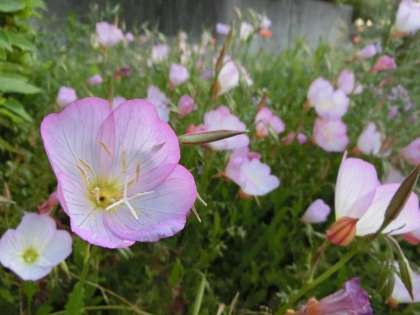 校舎2棟と3棟の間の花壇では、ツキミソウ(月見草)がきれいに咲いています。「ツキミソウ」は、夕方から白い花を咲かせ、朝には花びらのふちから段々とピンク色に変わっていきます。また、「ヒルザキツキミソウ」という種類もあり、名前の通り、昼でも花が咲いている月見草です。他の種と同じように夕方から咲きますが、朝に枯れることなく咲き続けます。