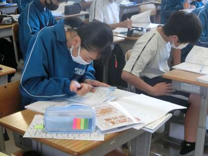 「文字式を利用して説明しよう」をテーマに証明の学習に近い問題を解いていました。