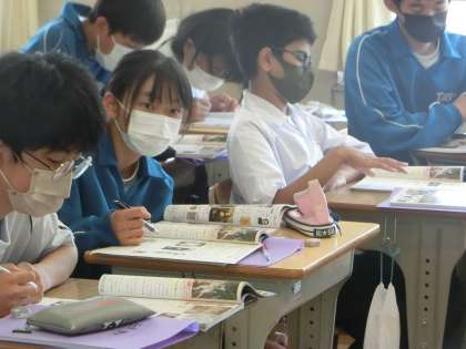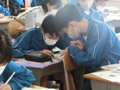教科担任の発問を熱心に聴き、教科書や資料集などから一生懸命答えを探している生徒の姿が印象的でした。