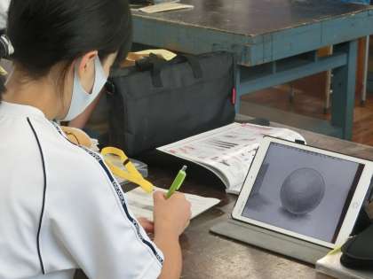 ハッチングの技法を使って、円の図形に明暗をつけ、立体的に見えるように手を加えていきます。