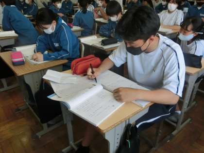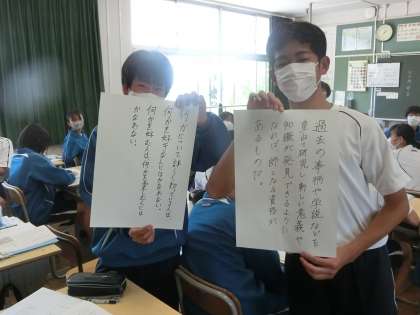 気に入った内容の論語をグループで決定し、日本語訳や意味などを調べていきます。苦労して調べ上げたもののため、どのグループも自信を持って発表していました。