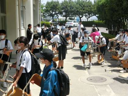 厳しい暑さの中、予定されていた活動を終え、教室に戻っていきます。椅子の脚の汚れをふき取った雑巾を洗ったり、使用した道具を率先して片付けている生徒の姿もありました。