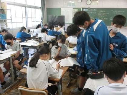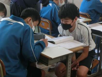 途中、+(プラス)と−(マイナス)が変わったりする場合を慎重に見極め、確実に計算をしていきます。仲間との教え合い、教科担任に自分から質問するなど、積極的な姿が印象的でした。