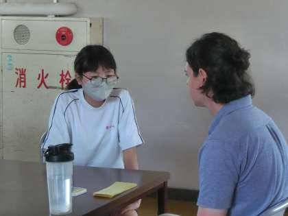 今日はALTとのコミュニケーションの時間で、スピーキングテストが行われていました。すでにテストが終わった生徒とこれからテストを受ける生徒の表情がずいぶん違います。緊張の度合いがいつもの授業ではありえないほどのようです。教科担任や仲間を相手に、直前まで練習に励んでいました。
