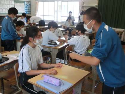 5/18 緊張感がハンパない !? 2 公開日 2023/05/18 更新日 2023/05/18 各学年から 2年1組の英語の授業の様子です。 今日はALTとのコミュニケーションの時間で、スピーキングテストが行われていました。すでにテストが終わった生徒とこれからテストを受ける生徒の表情がずいぶん違います。緊張の度合いがいつもの授業ではありえないほどのようです。教科担任や仲間を相手に、直前まで練習に励んでいました。