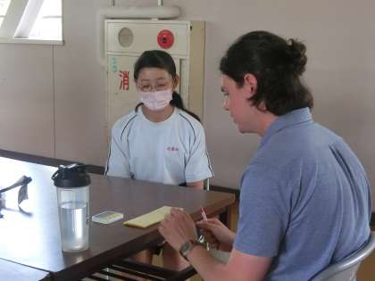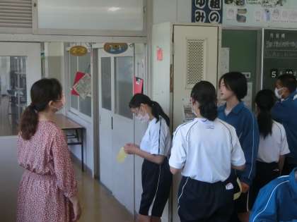 5/18 緊張感がハンパない !? 3 公開日 2023/05/18 更新日 2023/05/18 各学年から 2年1組の英語の授業の様子です。 今日はALTとのコミュニケーションの時間で、スピーキングテストが行われていました。すでにテストが終わった生徒とこれからテストを受ける生徒の表情がずいぶん違います。緊張の度合いがいつもの授業ではありえないほどのようです。教科担任や仲間を相手に、直前まで練習に励んでいました。