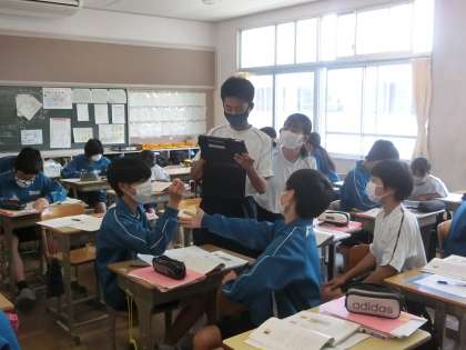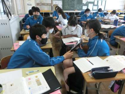 また、旧仮名遣いの本文を何度も音読していました。内容をイメージしやすくするため、教科担任がタブレットで画像を配信し、グループで確認していました。