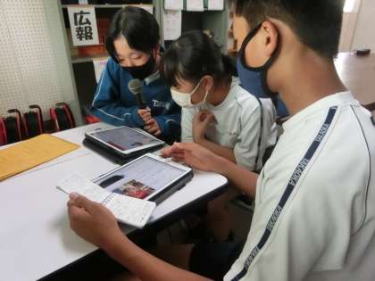 5/18 有意義な時間に… 公開日 2023/05/18 更新日 2023/05/18 特別活動 お昼の放送で先生紹介を行う生徒会役員の様子です。 事前に全員の先生にインタビューをし、放送原稿も自分たちで考えている生徒会役員のメンバー。給食時が少しでも楽しいものになるようにと、発表の仕方にもいくつかの工夫が見られました。