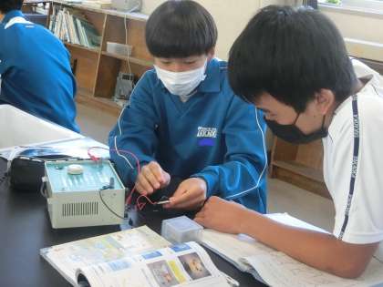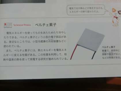 教科書にも掲載されている電気エネルギーを練るエネルギーに変える「ペルチェ素子」を実際に使い、エネルギーの移り変わりを体感していました。